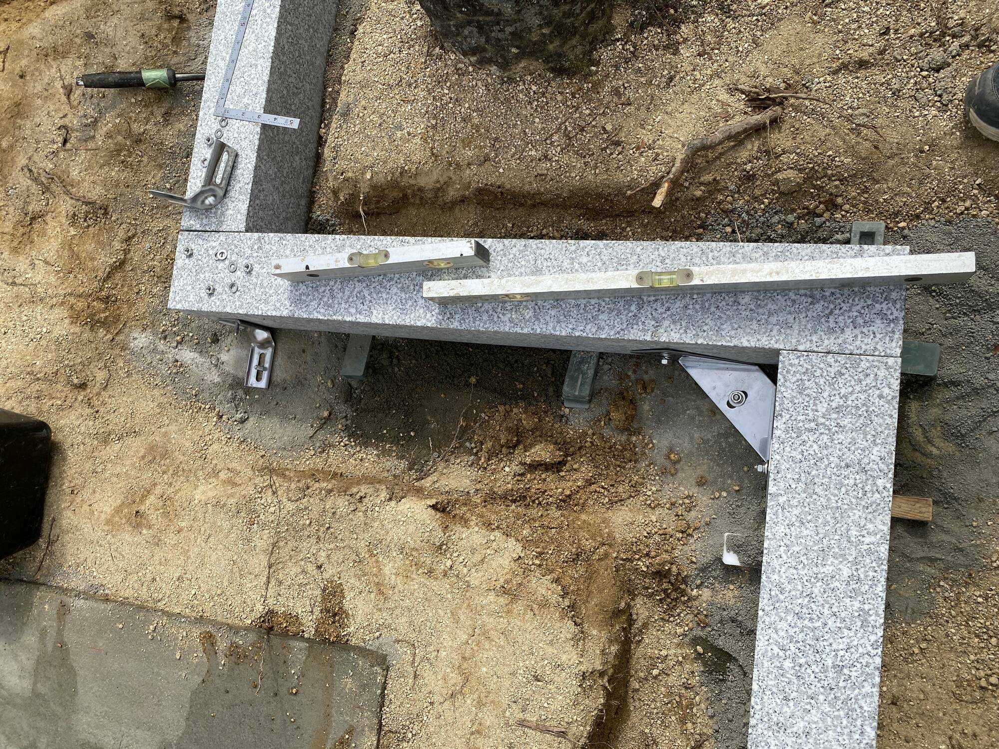 前回までで墓石、墓誌は据え付け完了しておりますので、残りの灯篭の台石を据え付け、墓地内に規定高さまで土を敷き均していきます。