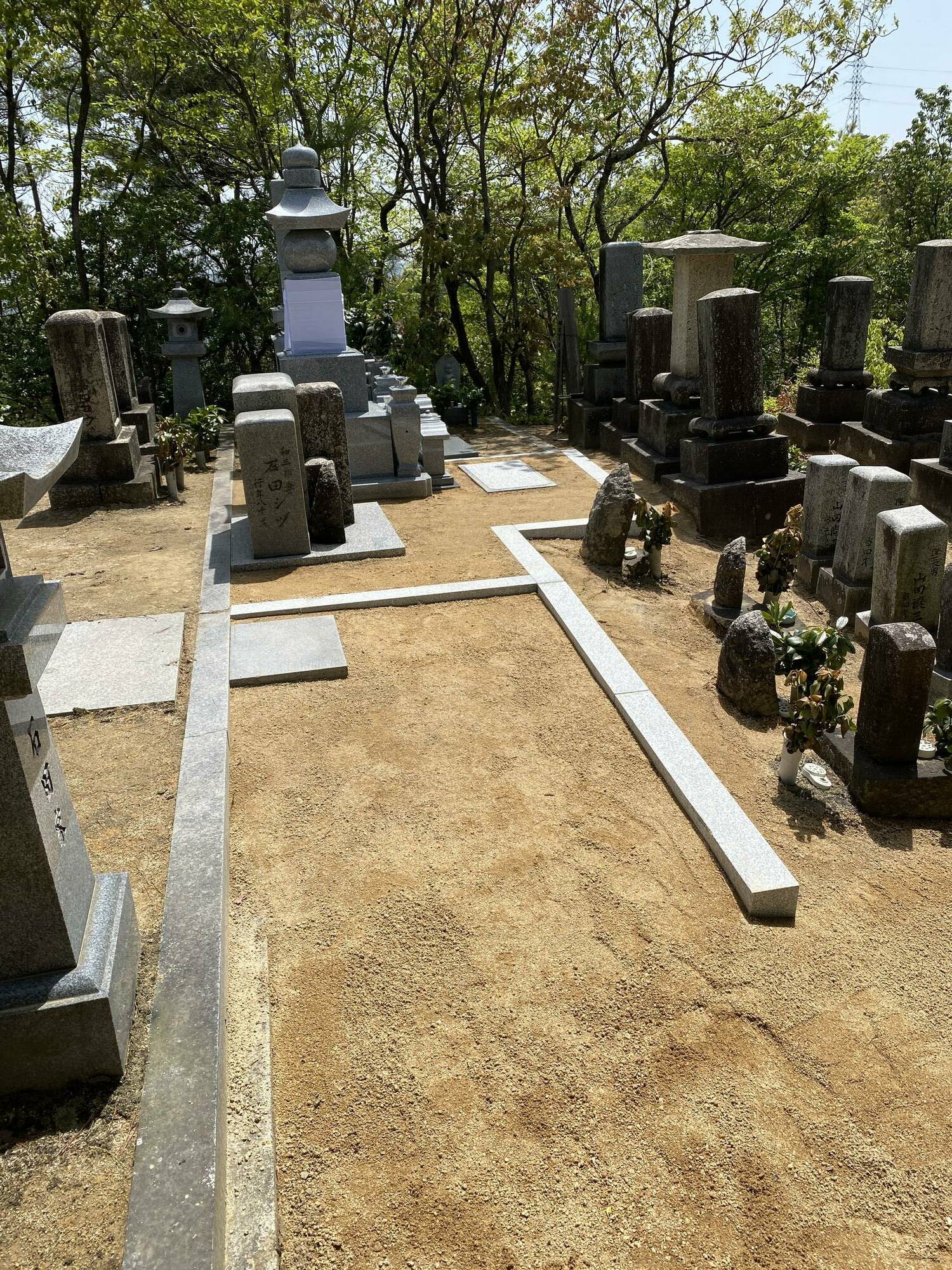 古墓の据え付け、墓地外の土留めの為の石材の据え付けなどを行い、整地、清掃を行って完了です。