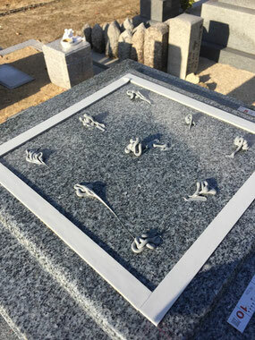 門柱上の角置き灯篭も据え付けて残すは墓誌と線香蝋燭立ての据え付けのみとなりました。