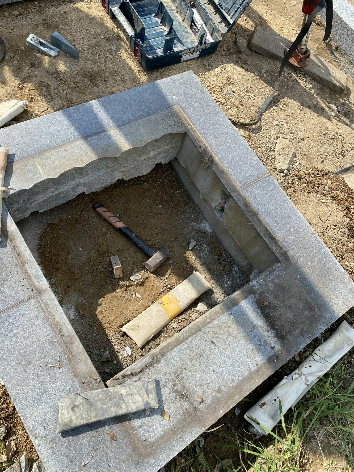 しかも深さも結構とってあり、芝台との接着もセメントノロがしっかりとついていてなかなか解体できませんでした。ドリルやノミを使用して解体していきます。
