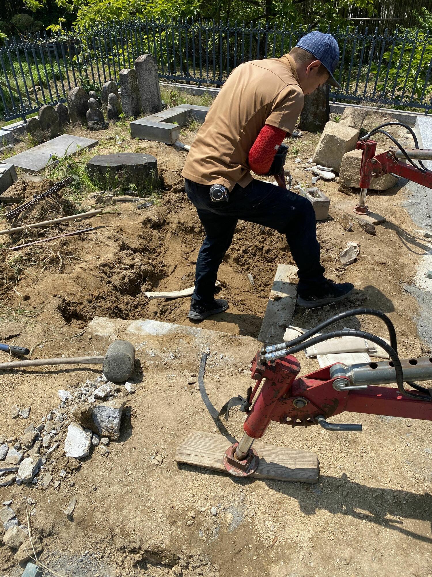 解体した後に墓地内の整理をして、基礎コンクリート打設の為の掘削に取り掛かります。